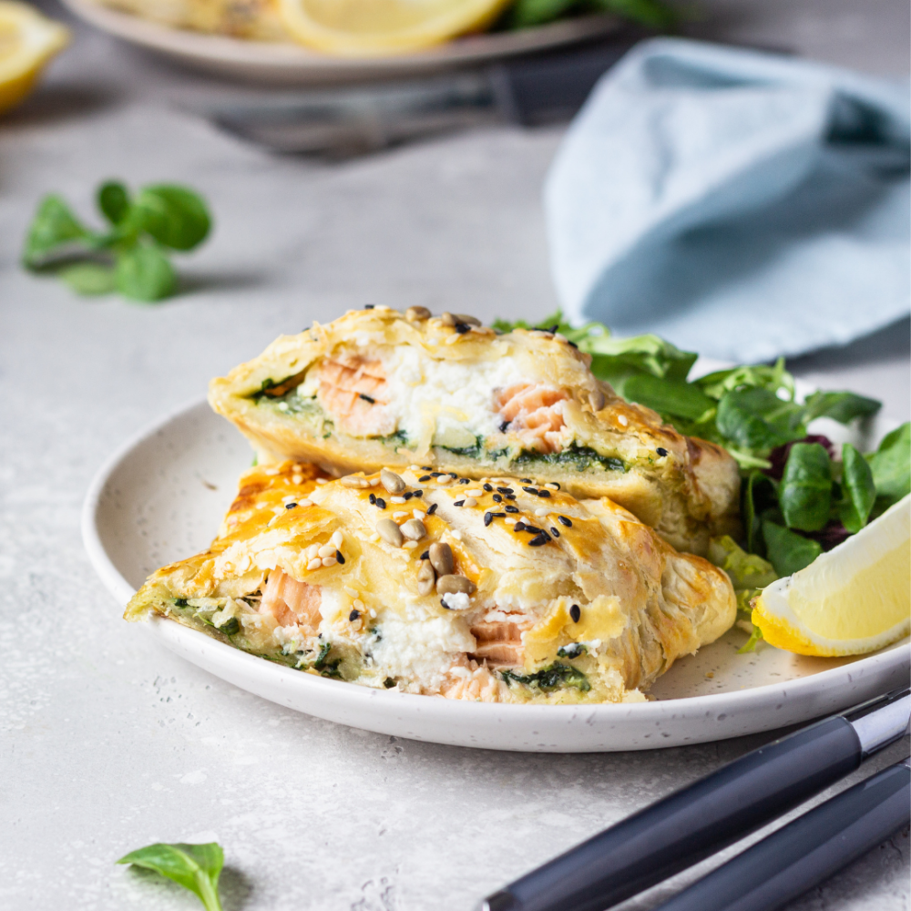 - Falten Sie den Blätterteig um den Lachs, so dass die Filets gut bedeckt sind. Drücken Sie die Ränder leicht an, um sie zu versiegeln.